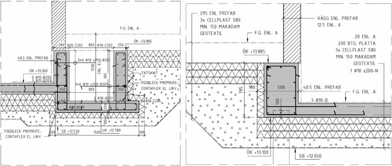 Arbetet inkluderade val och utformning av grundsystem, exempelvis bottenplatta med kantbalkar eller pålad lösning, samt framtagning av armeringsritningar, sektioner och konstruktionsdetaljer. Hänsyn togs till laster från flerbostadshusets omfattning, brandkrav och fuktsäkerhet.